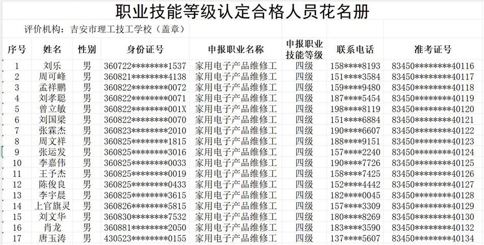 按照《贛人社規(guī)〔2022〕7號(hào)》文件精神。我校于2025年10月24日開(kāi)展了家用電子產(chǎn)品維修工等級(jí)認(rèn)定,共20人(四級(jí)),通過(guò)認(rèn)定考核17人?,F(xiàn)對(duì)認(rèn)定考核合格人員進(jìn)行公示。(名單附后)