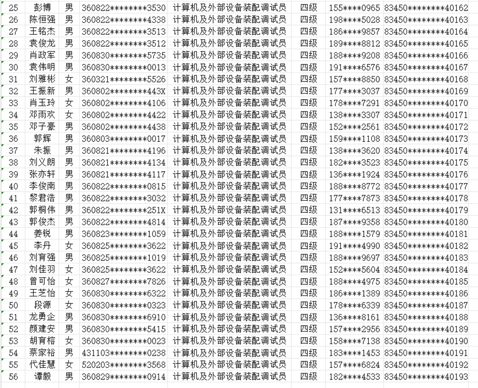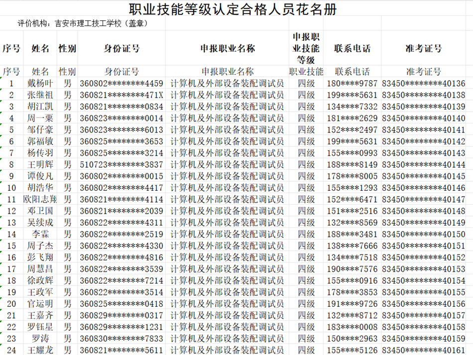 按照《贛人社規(guī)〔2022〕7號》文件精神。我校于2025年10月24日開展了計算機及外部設(shè)備裝配調(diào)試員(計算機整機裝配調(diào)試員)等級認(rèn)定,共58人(四級),通過認(rèn)定考核56人。現(xiàn)對認(rèn)定考核合格人員進(jìn)行公示。(名單附后)