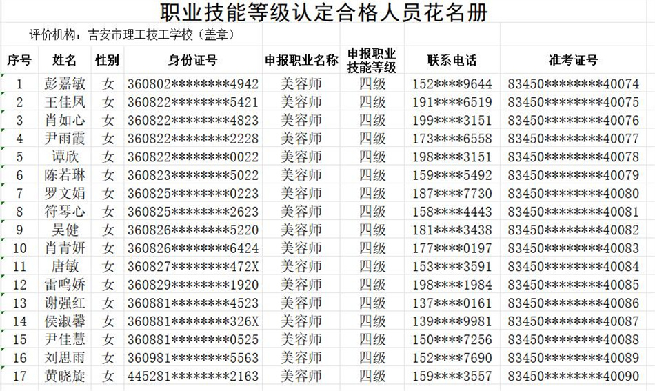 按照《贛人社規(guī)〔2022〕7號》文件精神。我校于2025年10月24日開展了美容師等級認定,共17人(四級),通過認定考核17人?,F(xiàn)對認定考核合格人員進行公示。(名單附后)